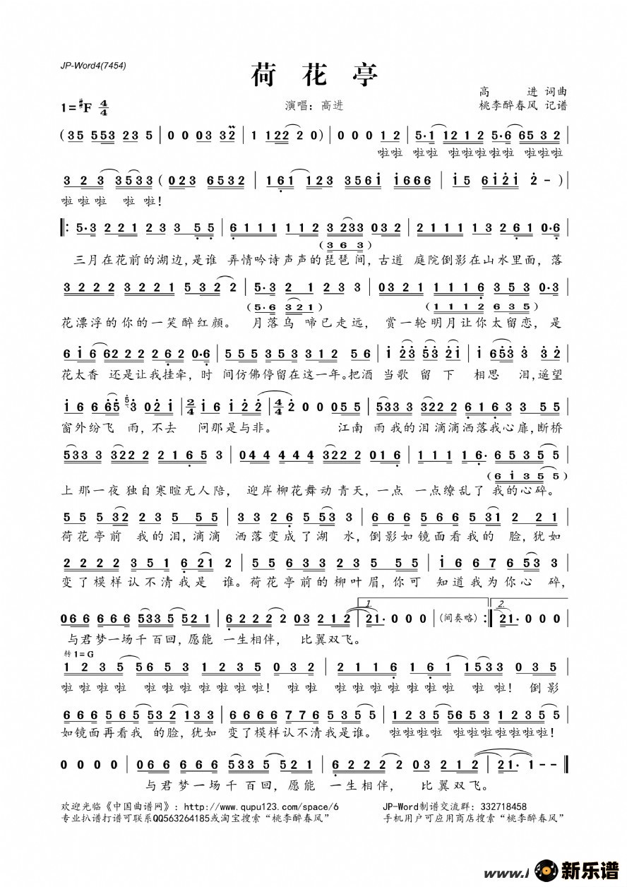 高进演唱的荷花亭歌词,荷花亭简谱.