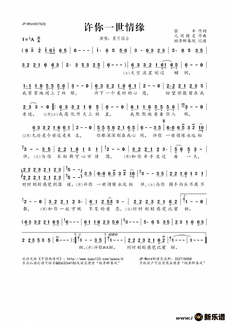 许你一世情缘星月组合 星月组合演唱的许你一世情缘歌词,许你一世情缘简谱. 女:天空流星划过瞬间我紧紧地闭上了双眼许下一个美好的心愿盼望你能留在我身边男:我愿化作天上的星我默默地看着你入眠无论是今世还是来生你都深深刻在我心间男:许你一世情缘永远相伴女:与你长相厮守心甘情愿男:和你牵手度过每一天合:时时刻刻感觉到温暖男:许你一世情缘永远相伴女:与你携手白头不离不散男:和你一起守候不变的爱恋女:时时刻刻感觉比蜜甜女:我愿化作天上的星我默默地看着你入眠男:无论是今世还是来生你都深深刻在我心间男:许你一世情缘永远相伴女:与你长相厮守心甘情愿男:和你牵手度过每一天合:时时刻刻感觉到温暖男:许你一世情缘永远相伴女:与你携手白头不离不散男:和你一起守候不变的爱恋合:时时刻刻感觉比蜜甜男:许你一世情缘永远相伴女:与你长相厮守心甘情愿男:和你牵手度过每一天合:时时刻刻感觉到温暖男:许你一世情缘永远相伴女:与你携手白头不离不散男:和你一起守候不变的爱恋合:时时刻刻感觉比蜜甜时时刻刻感觉比蜜甜 此简谱由新乐谱会员 桃李醉春风 上传