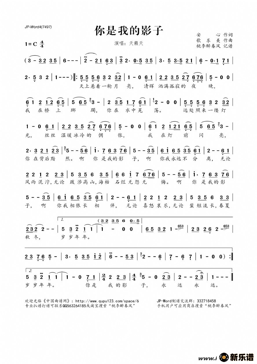 《你是我的影子》简谱 天籁天-桃李醉春风制谱