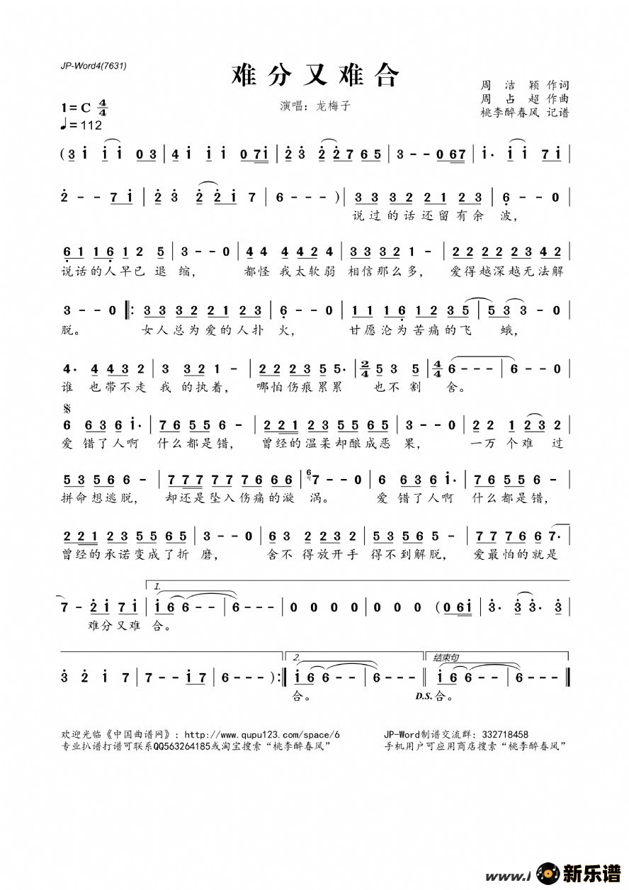 龙梅子演唱的难分又难合歌词,难分又难合简谱.