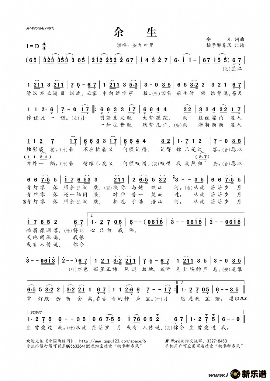 《余生》简谱 安九/叶里-桃李醉春风制谱