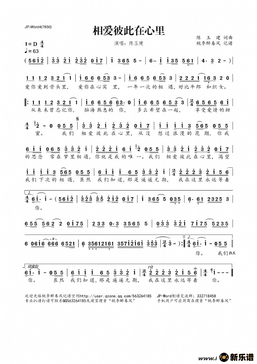 《相爱彼此在心里》简谱 陈玉建-桃李醉春风制谱