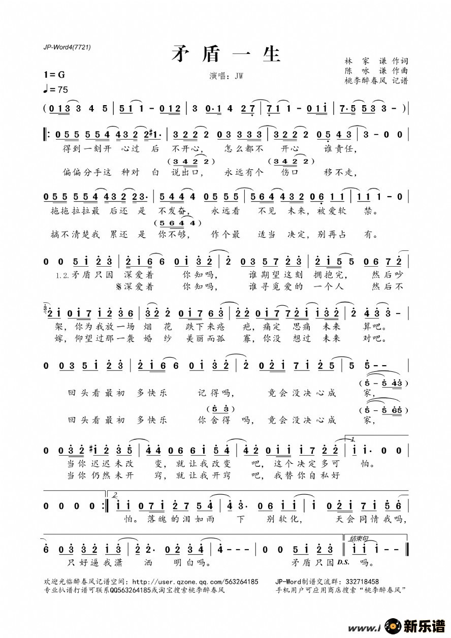 《矛盾一生》简谱 Jw-桃李醉春风制谱
