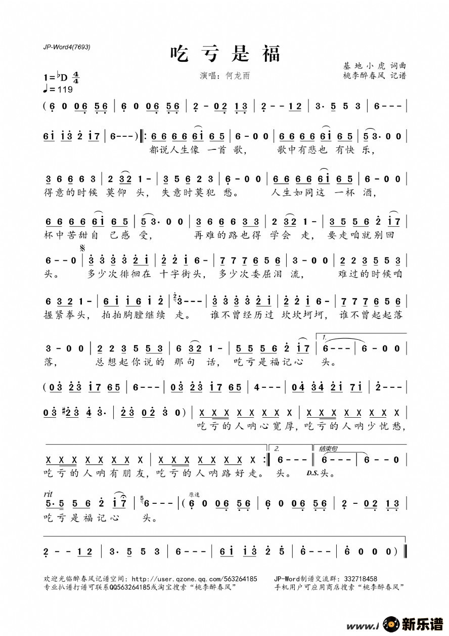 何龙雨演唱的吃亏是福歌词,吃亏是福简谱.