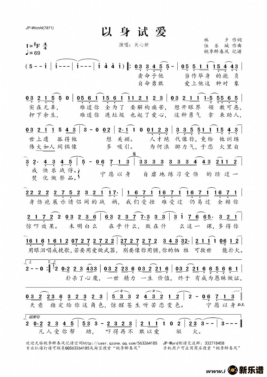 关心妍演唱的以身试爱歌词,以身试爱简谱.