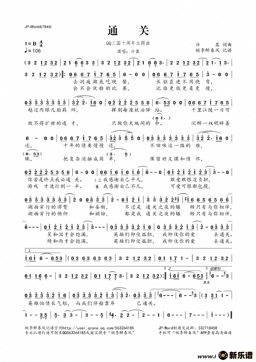 《通关(qq三国十周年主题曲)》简谱 许嵩-桃李醉春风制谱