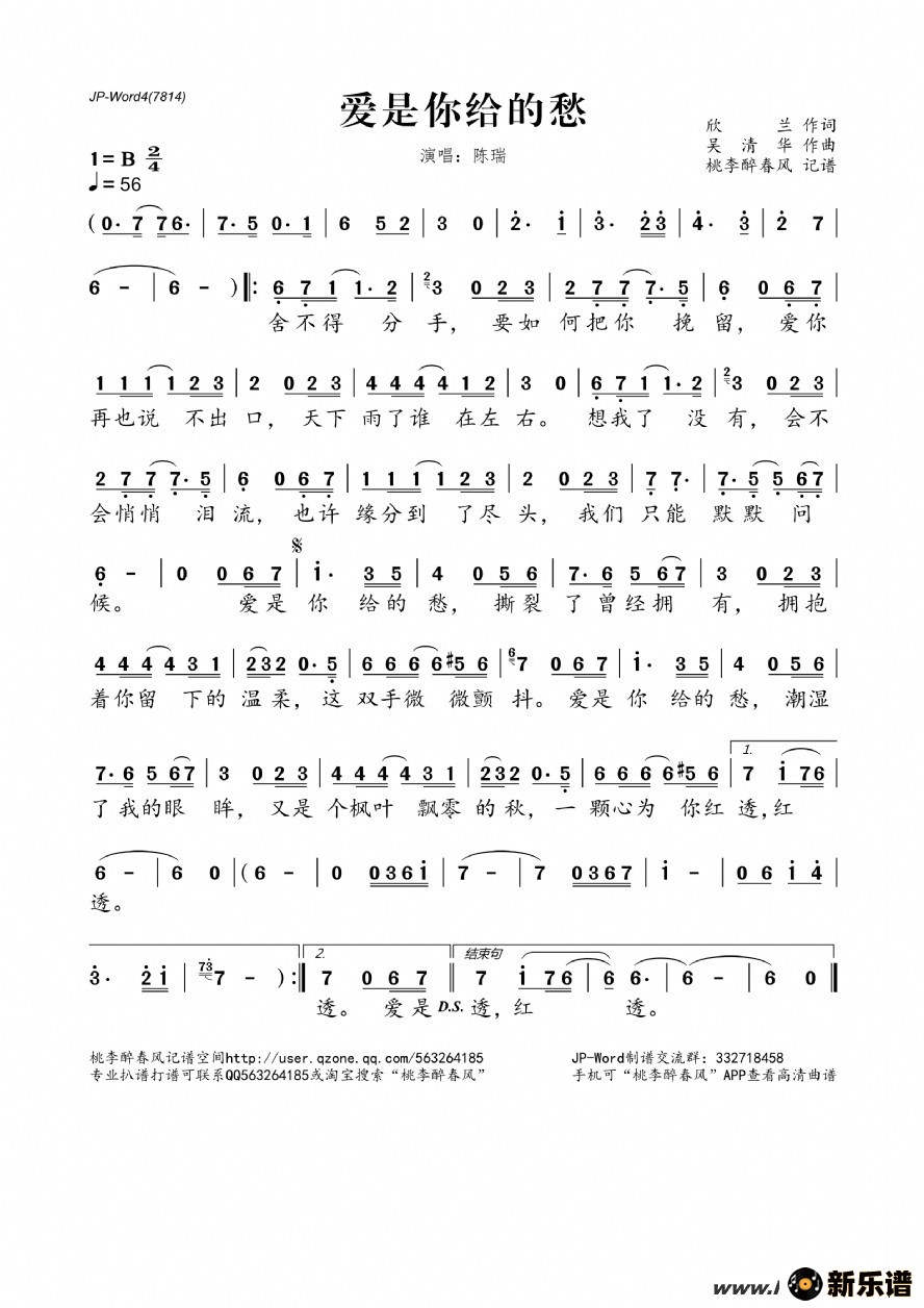 《爱是你给的愁》简谱 陈瑞-桃李醉春风制谱