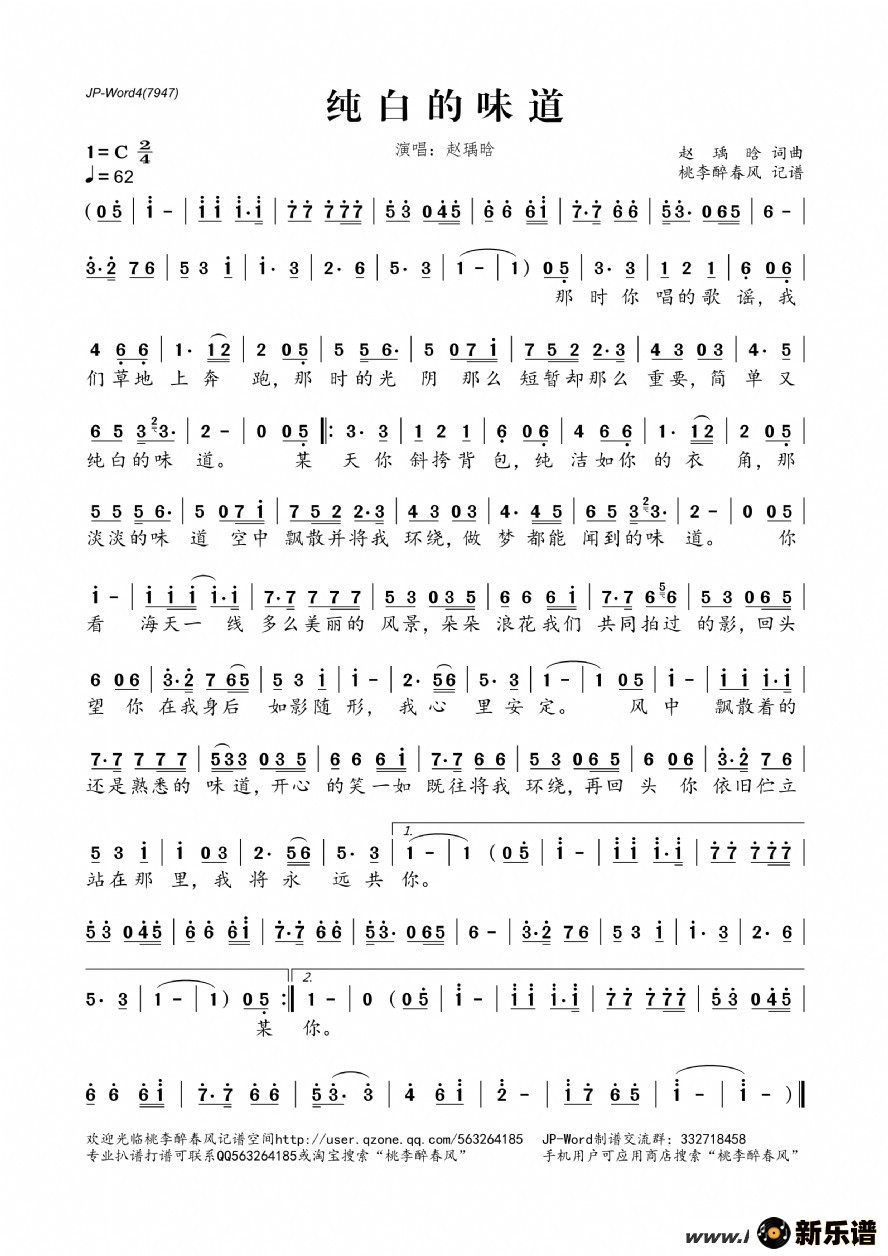 赵瑀晗演唱的纯白的味道歌词,纯白的味道简谱.