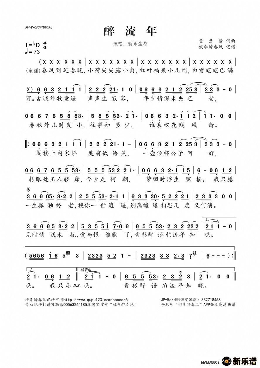 新乐尘符演唱的醉流年歌词,醉流年简谱.