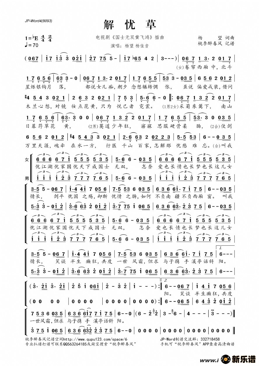 解忧草(《国士无双黄飞鸿》电视剧插曲对唱版)杨望、杨佳音 杨望、杨佳音演唱的解忧草(《国士无双黄飞鸿》电视剧插曲对唱版)歌词,解忧草(《国士无双黄飞鸿》电视剧插曲对唱版)简谱. 此简谱由新乐谱会员 桃李醉春风 上传