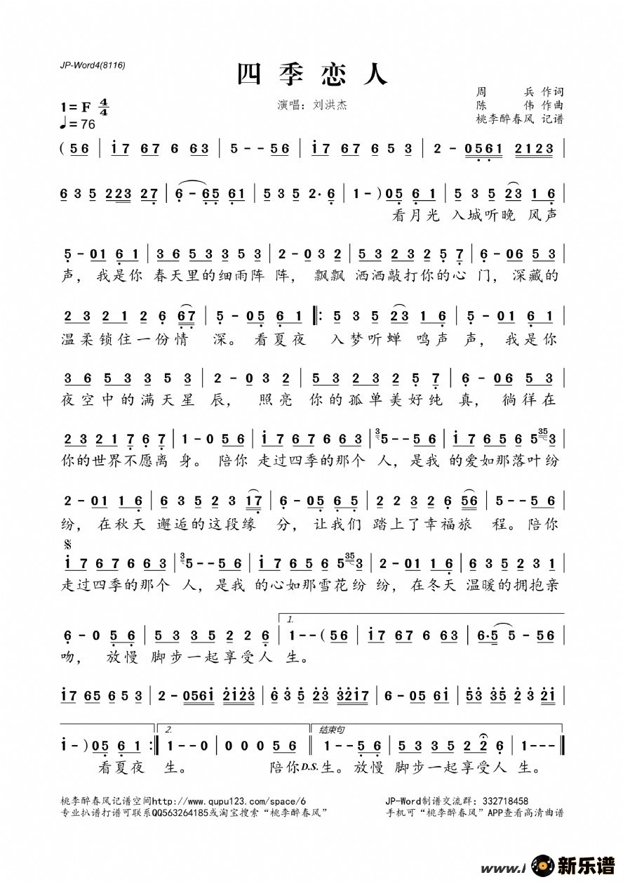 刘洪杰演唱的四季恋人歌词,四季恋人简谱.