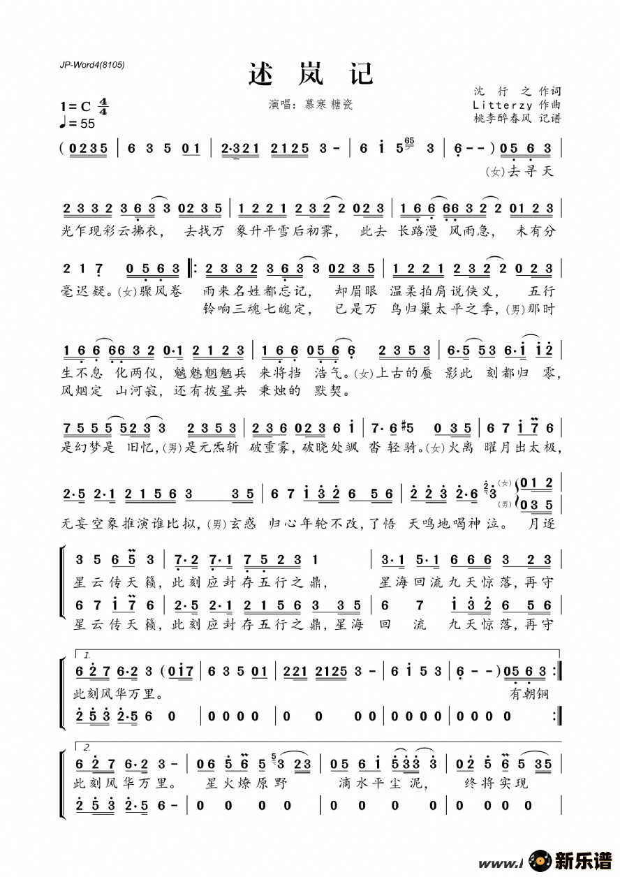 慕寒、糖瓷演唱的述岚记歌词,述岚记简谱.