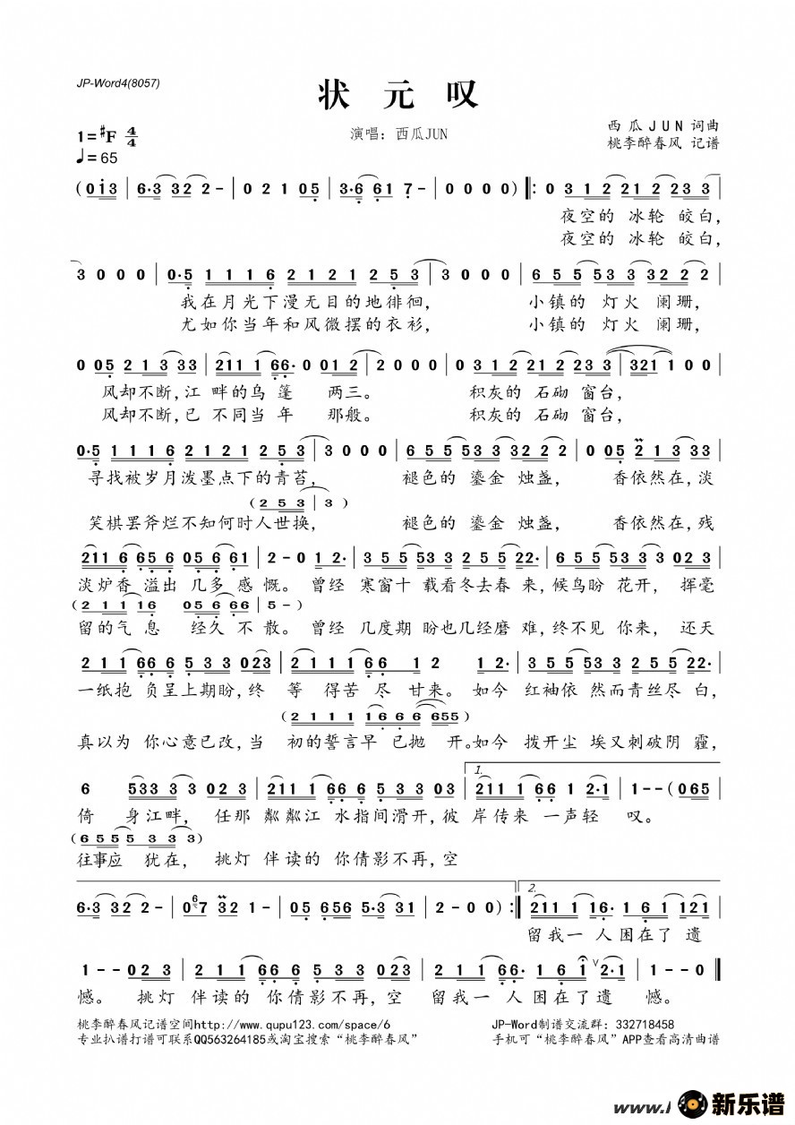 西瓜JUN演唱的状元叹歌词,状元叹简谱.