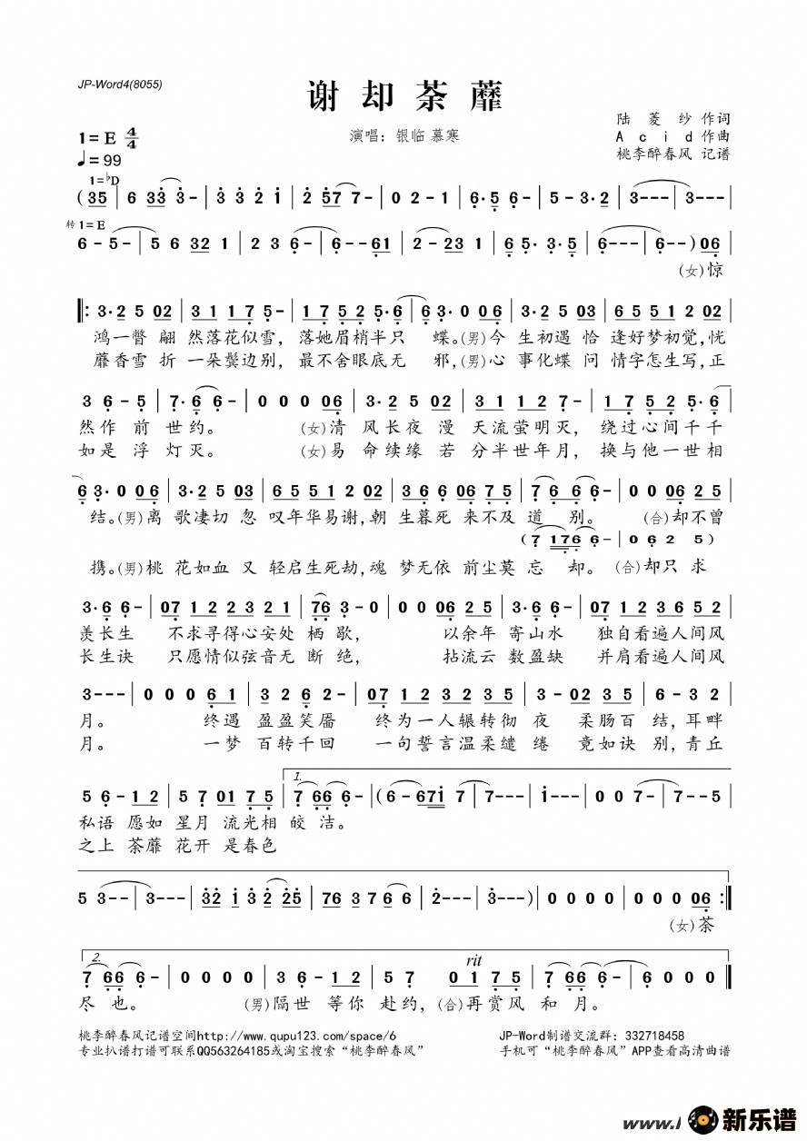 银临、慕寒演唱的谢却荼蘼歌词,谢却荼蘼简谱.