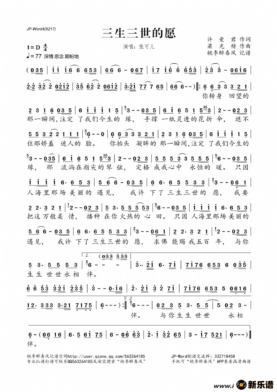 《三生三世的愿》简谱 张可儿-桃李醉春风制谱