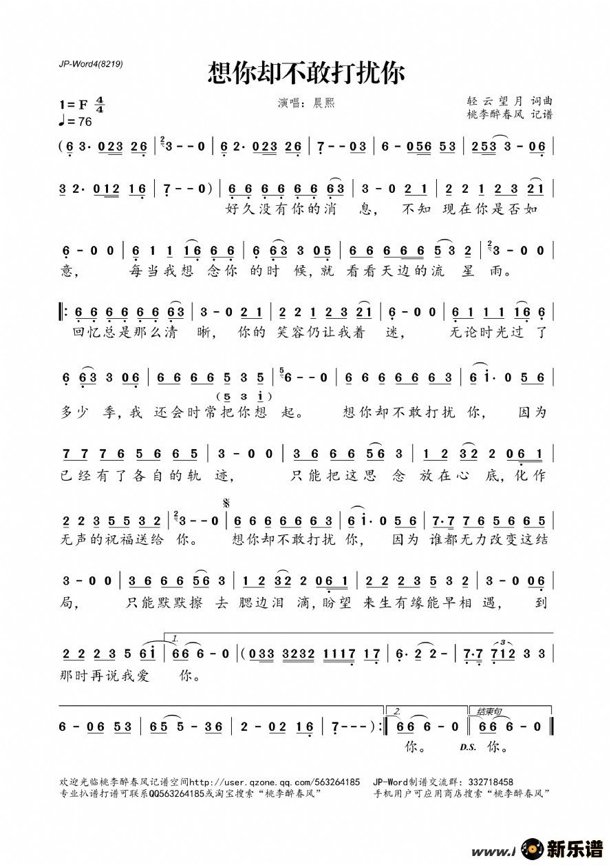 想你却不敢打扰你晨熙 晨熙演唱的想你却不敢打扰你歌词,想你却不敢打扰你简谱. 好久没有你的消息不知现在你是否如意每当我想念你的时候就看看天边的流星雨回忆总是那么清晰你的笑容仍让我着迷无论时光过了多少季我还会时常把你想起想你却不敢打扰你因为已经有了各自的轨迹只能把这思念放在心底化作无声的祝福送给你想你却不敢打扰你因为谁都无力改变这结局只能默默擦去腮边泪滴盼望来生有缘能早相遇到那时再说我爱你回忆总是那么清晰你的笑容仍让我着迷无论时光过了多少季我还会时常把你想起想你却不敢打扰你因为已经有了各自的轨迹只能把这思念放在心底化作无声的祝福送给你想你却不敢打扰你因为谁都无力改变这结局只能默默擦去腮边泪滴盼望来生有缘能早相遇到那时再说我爱你想你却不敢打扰你因为谁都无力改变这结局只能默默擦去腮边泪滴盼望来生有缘能早相遇到那时再说我爱你 此简谱由新乐谱会员 桃李醉春风 上传