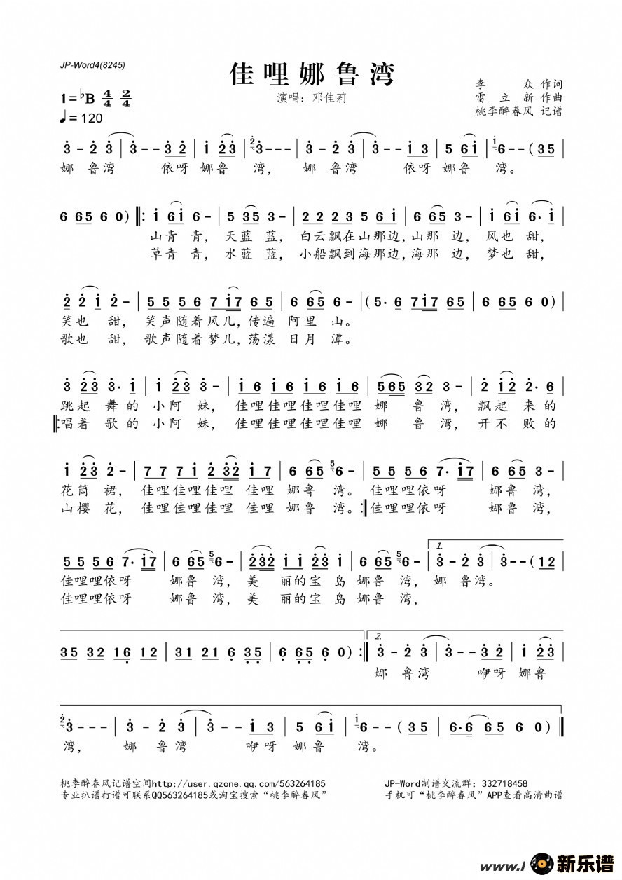 《佳哩娜鲁湾 》简谱 邓佳莉-桃李醉春风制谱