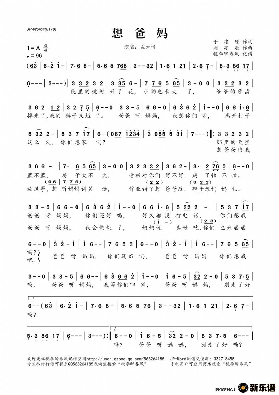 《想爸妈》简谱 孟天棋-桃李醉春风制谱