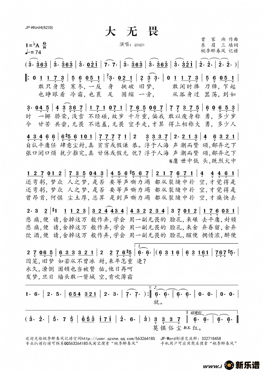 《大无畏》简谱 gogo-桃李醉春风制谱