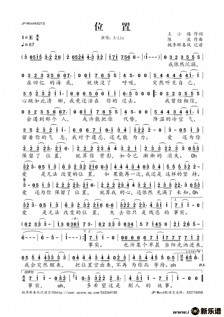 位置A-Lin A-Lin演唱的位置歌词,位置简谱. 我依然沉溺在回忆的海底就快没了呼吸突然听见自己心跳如此清晰我竟还活在你的过去我曾经相信会遇到那个人或许能把你代替降温的冷空气留着你的气息我对于遗忘还无能为力也许某个早晨的阳光洒进来我会突然醒来把位置空出来不再为你而等待爱还为你保留了位置就算我的心还依然充满了未知爱是无法改变的位置失去你只是残忍的事实多希望这是别人的故事 此简谱由新乐谱会员 桃李醉春风 上传