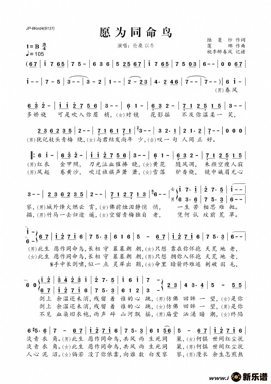 伦桑、以冬演唱的愿为同命鸟歌词,愿为同命鸟简谱.