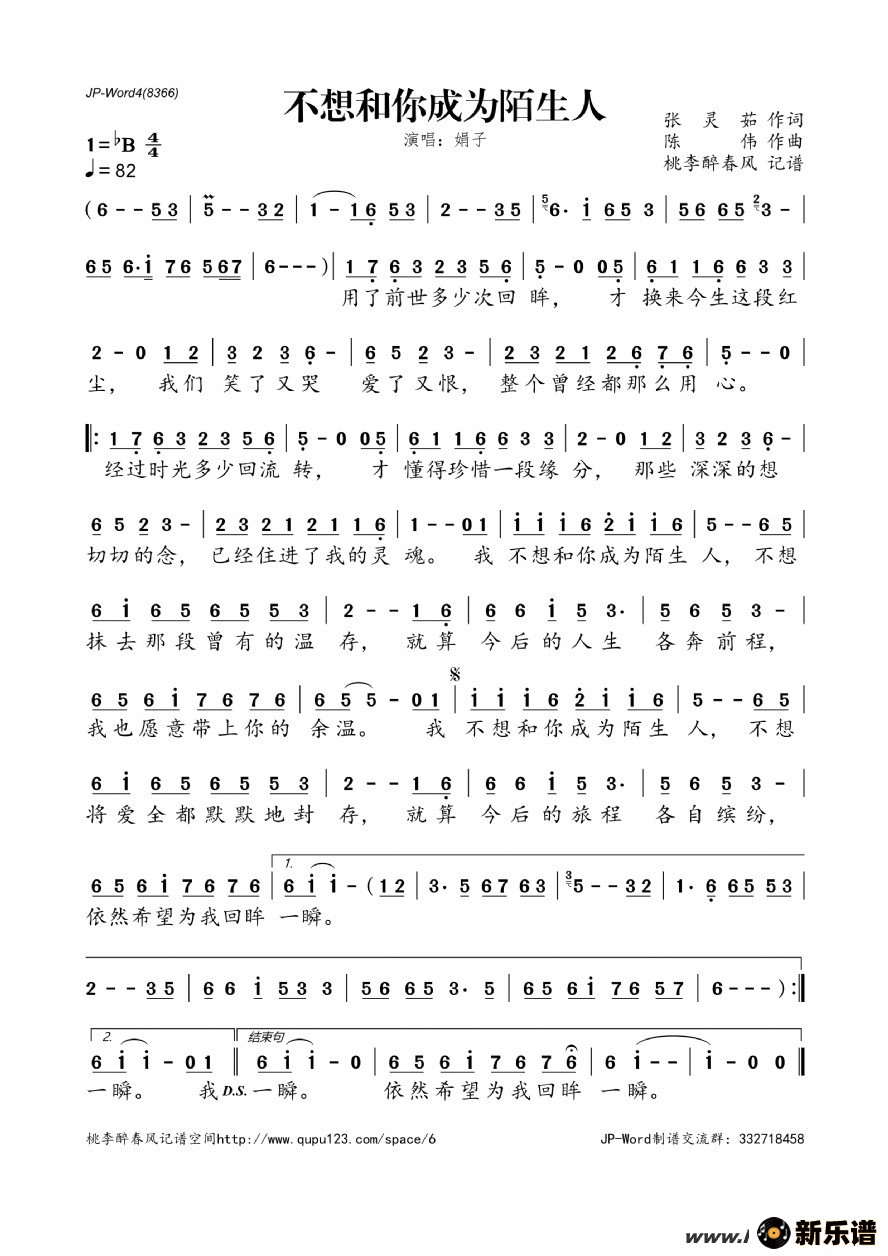 《不想和你成为陌生人》简谱 娟子-桃李醉春风制谱