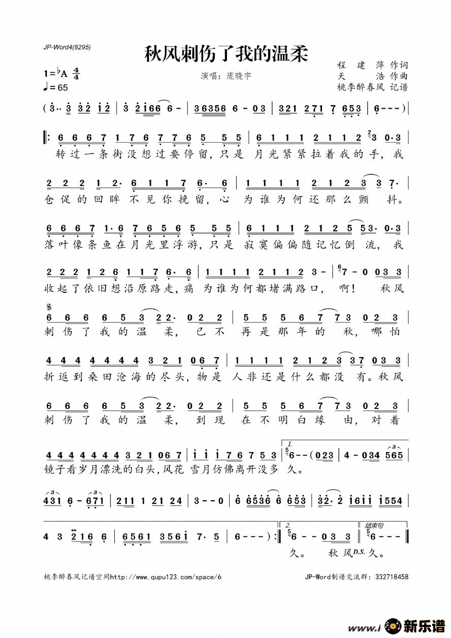 《秋风刺伤了我的温柔》简谱 庞晓宇-桃李醉春风制谱