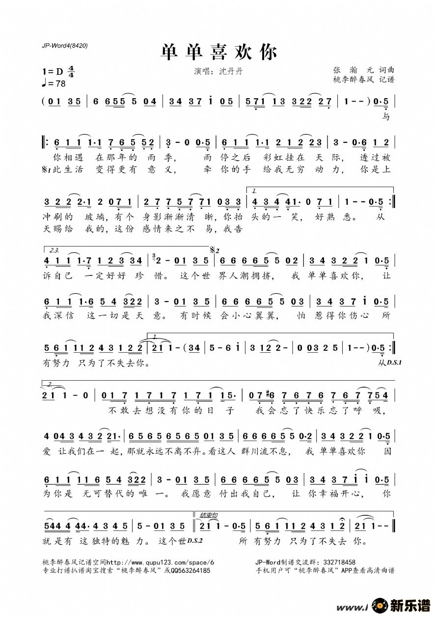 《单单喜欢你》简谱 沈丹丹-桃李醉春风制谱