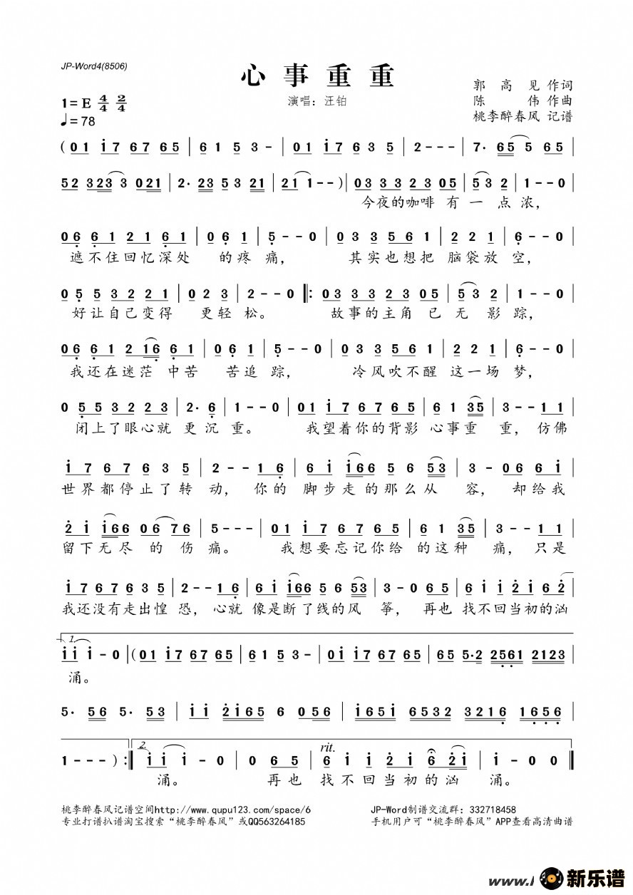 《心事重重》简谱 汪铂-桃李醉春风制谱