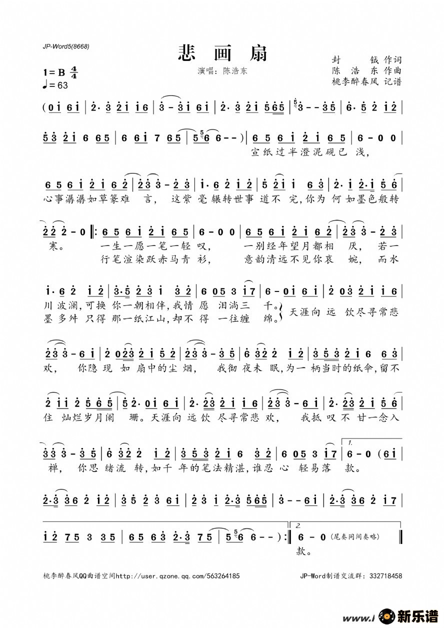 陈浩东演唱的悲画扇歌词,悲画扇简谱.