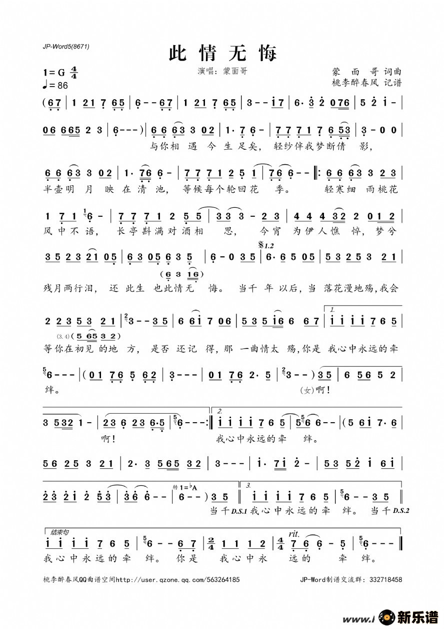 《此情无悔》简谱 蒙面哥-桃李醉春风制谱