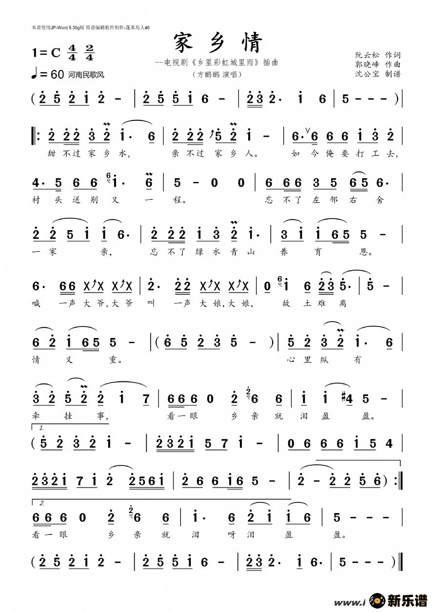 方鹂鹂演唱的家乡情歌词,家乡情简谱.