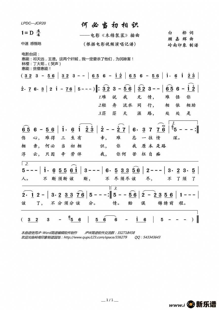 《何必当初相识(电影《木棉袈裟》插曲)》简谱 徐小明-岭南印象制谱