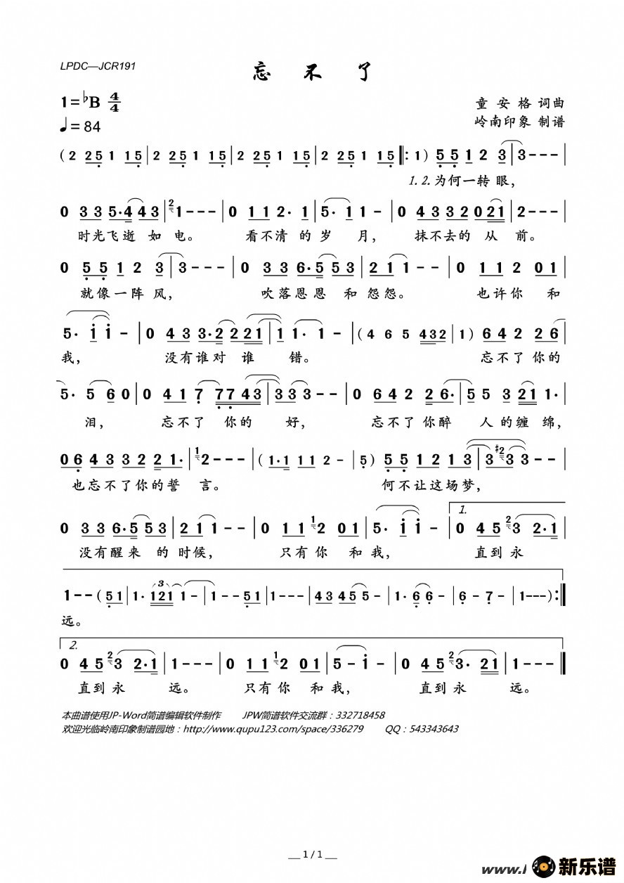 《忘不了》简谱 伽菲珈而-岭南印象制谱