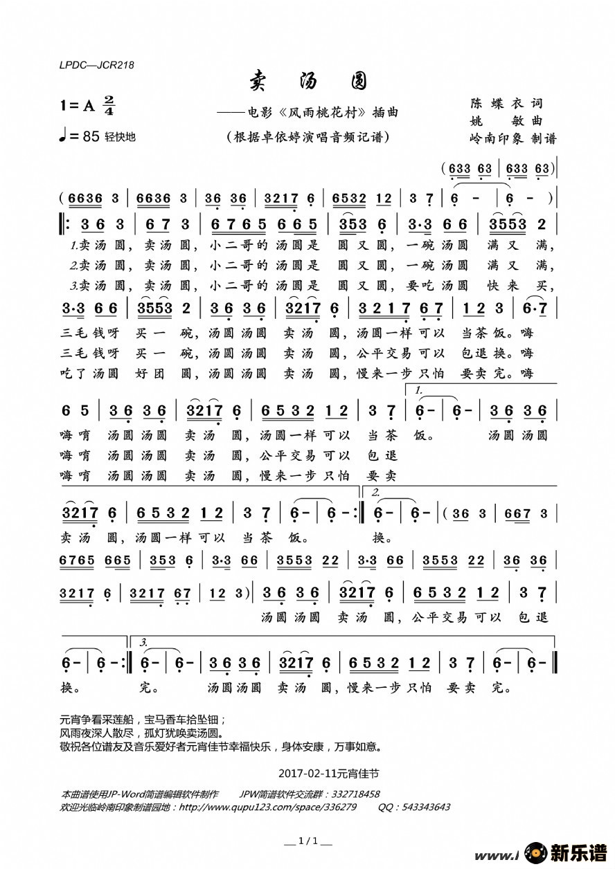 《卖汤圆(电影《风雨桃花村》插曲)》简谱 卓依婷-岭南印象制谱