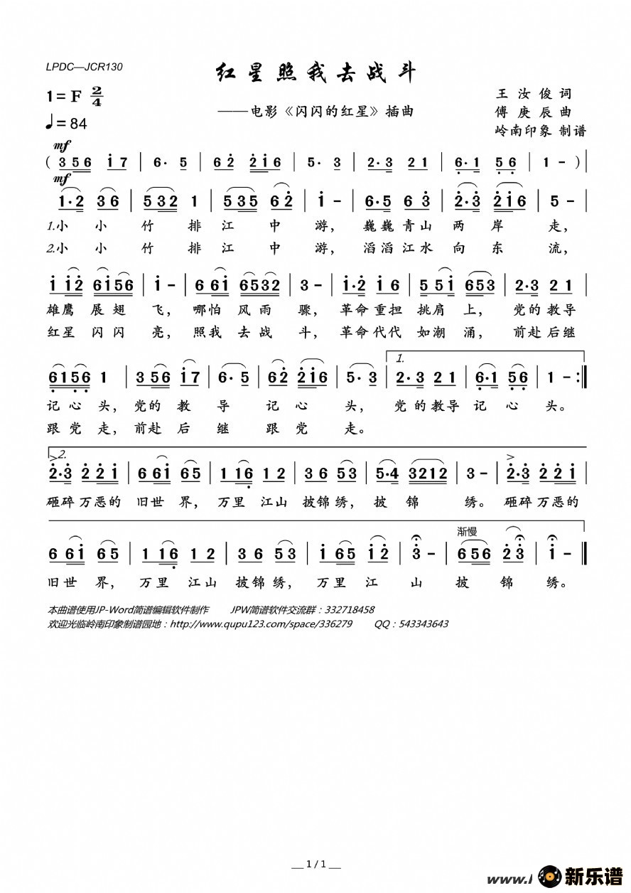 《红星照我去战斗(电影《闪闪的红星》插曲)》简谱 佚名-岭南印象制谱