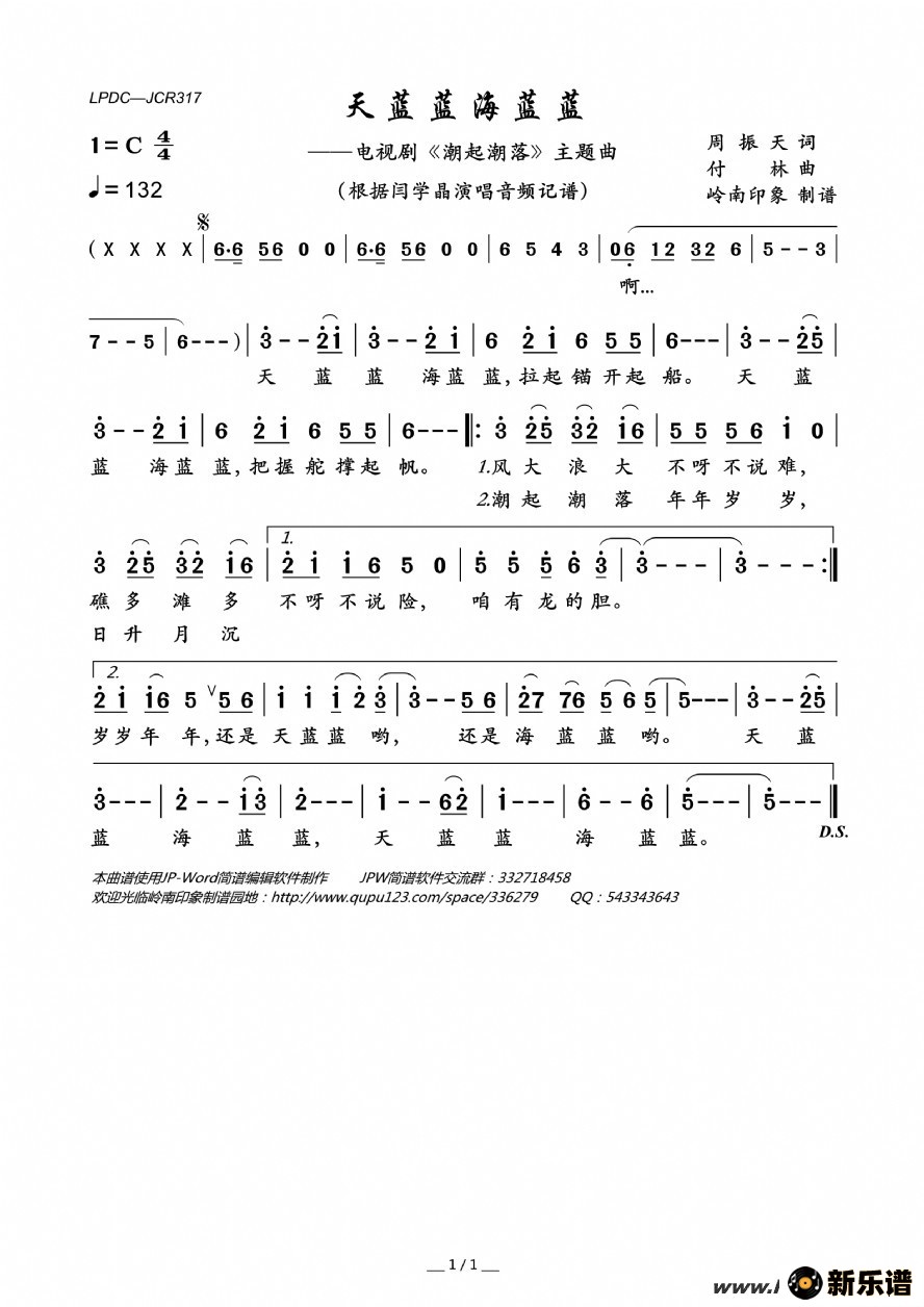 《天蓝蓝海蓝蓝(电视剧《潮起潮落》主题曲)》简谱 闫学晶-岭南印象制谱