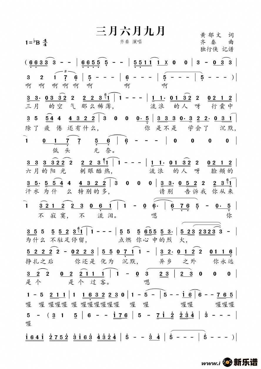 齐秦演唱的三月六月九月歌词,三月六月九月简谱.