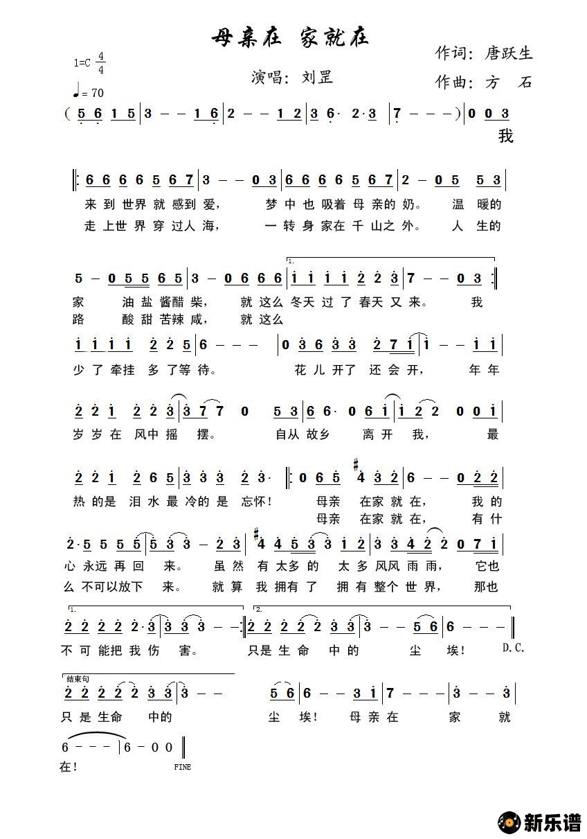 《母亲在家就在》简谱 刘罡、翁汕汕-心烛制谱