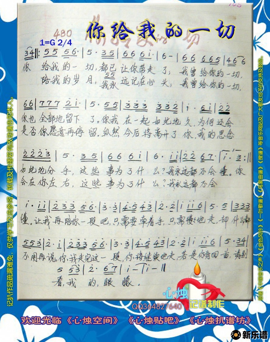 《你给我的一切》简谱 张蝶/常宽-心烛制谱
