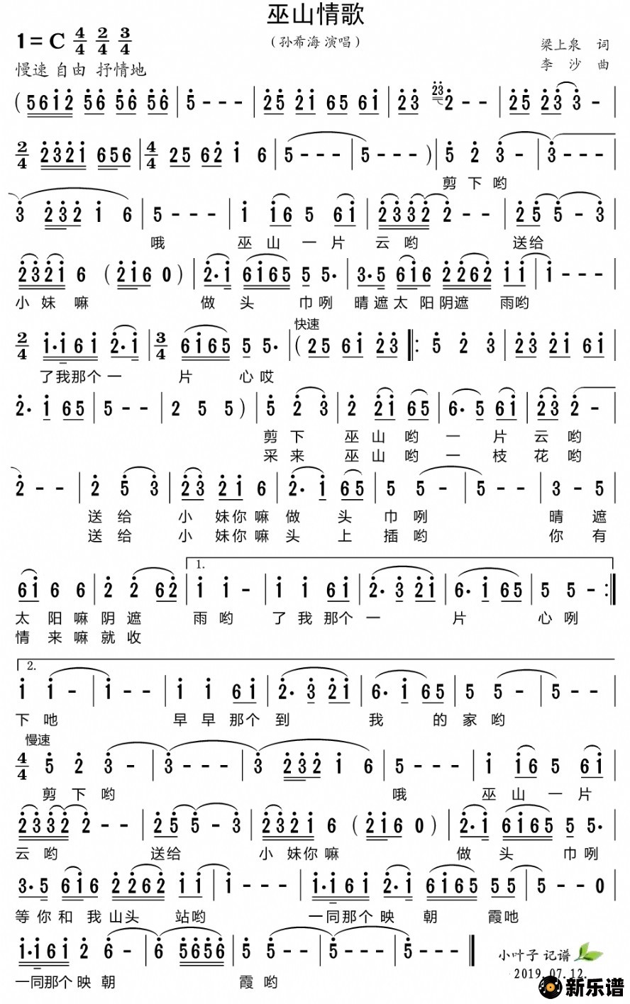 《巫山情歌》简谱 孙希海-小叶子制谱