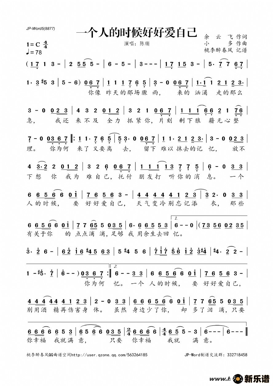 一个人的时候好好爱自己陈瑞 陈瑞演唱的一个人的时候好好爱自己歌词,一个人的时候好好爱自己简谱. 你像昨天的那场骤雨来的汹涌走的那么急我还来不及全力抓紧你片刻剩下狼藉无心整理你为何来了又要离去留下难以抹去的记忆放不下想你 我为难自己托付朋友打听你的消息一个人的时候要好好爱自己天气变冷别忘记添衣那些有关于你的点点滴滴足够我用余生去回忆你为何来了又要离去留下难以抹去的记忆放不下想你 我为难自己托付朋友打听你的消息一个人的时候要好好爱自己天气变冷别忘记添衣那些有关于你的点点滴滴足够我用余生去回忆一个人的时候要好好爱自己别用酒精再伤害身体虽然身边少了你 却多了泪滴只要你幸福我就 满意只要你幸福我就 满意 此简谱由新乐谱会员 桃李醉春风 上传