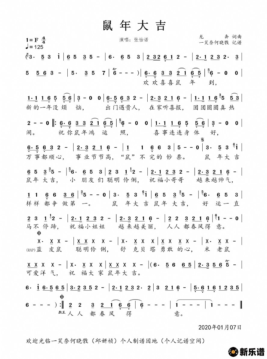 《鼠年大吉(女版)》简谱 张怡诺-一笑奈何晓斅制谱