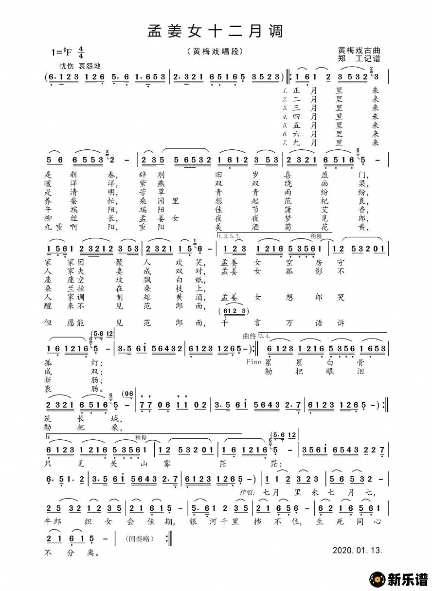 《孟姜女十二月调(黄梅戏版)》简谱 -郑工制谱