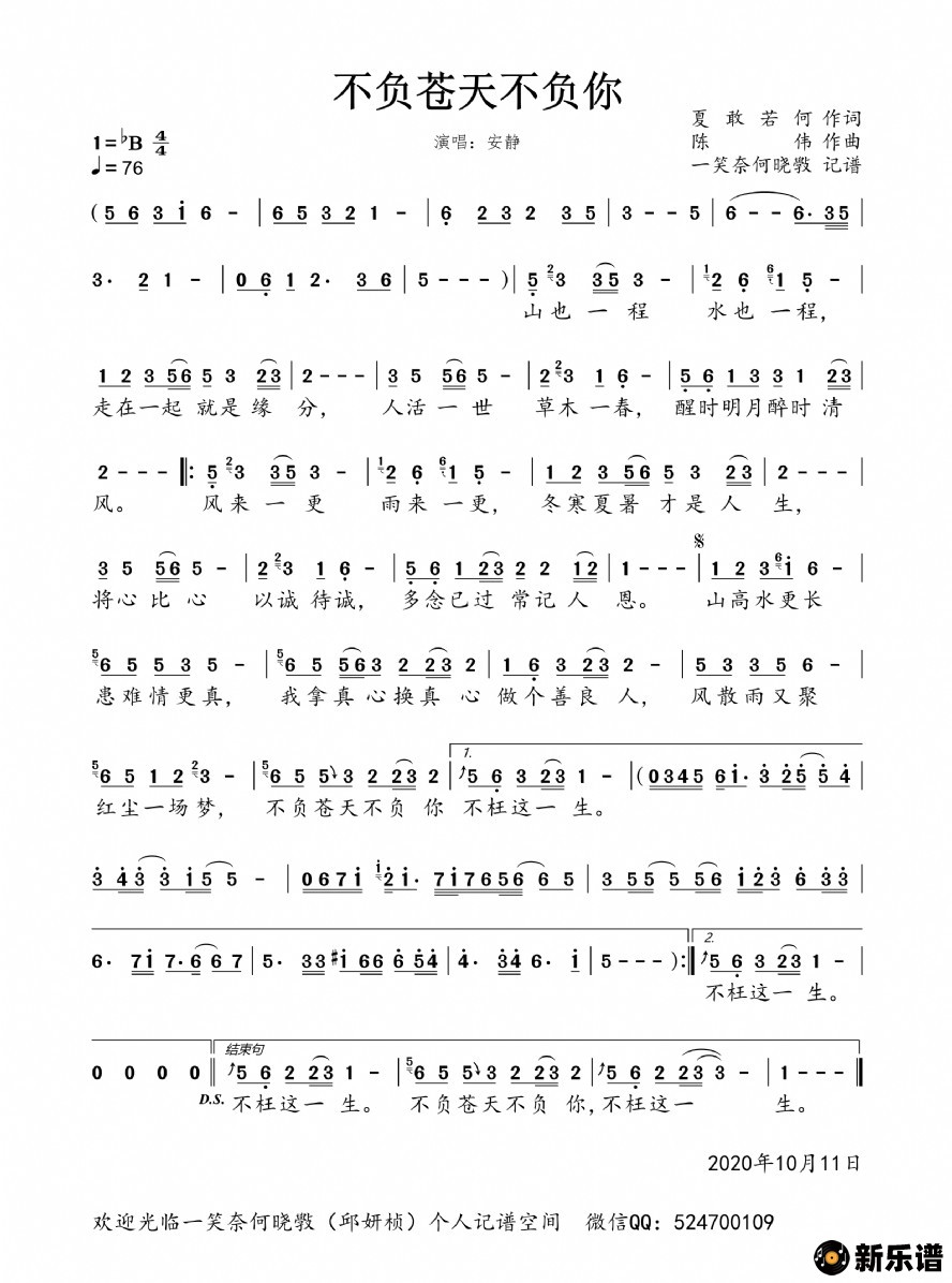 《不负苍天不负你》简谱 安静-一笑奈何晓斅制谱