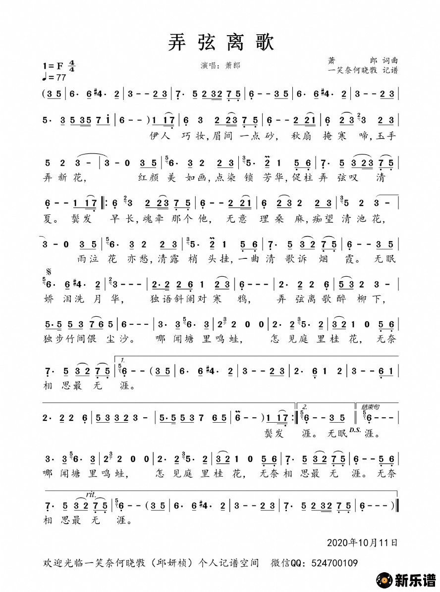 《弄弦离歌(男版)》简谱 萧郎-一笑奈何晓斅制谱