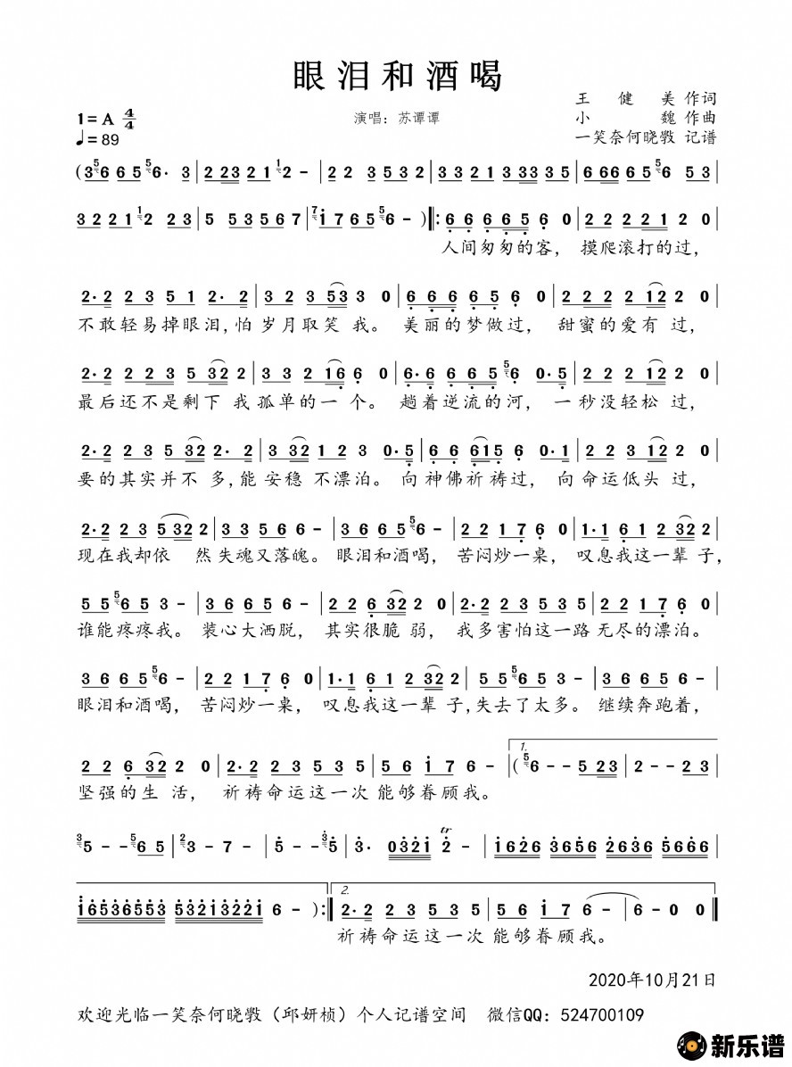 《眼泪和酒喝(女版)》简谱 苏谭谭-一笑奈何晓斅制谱