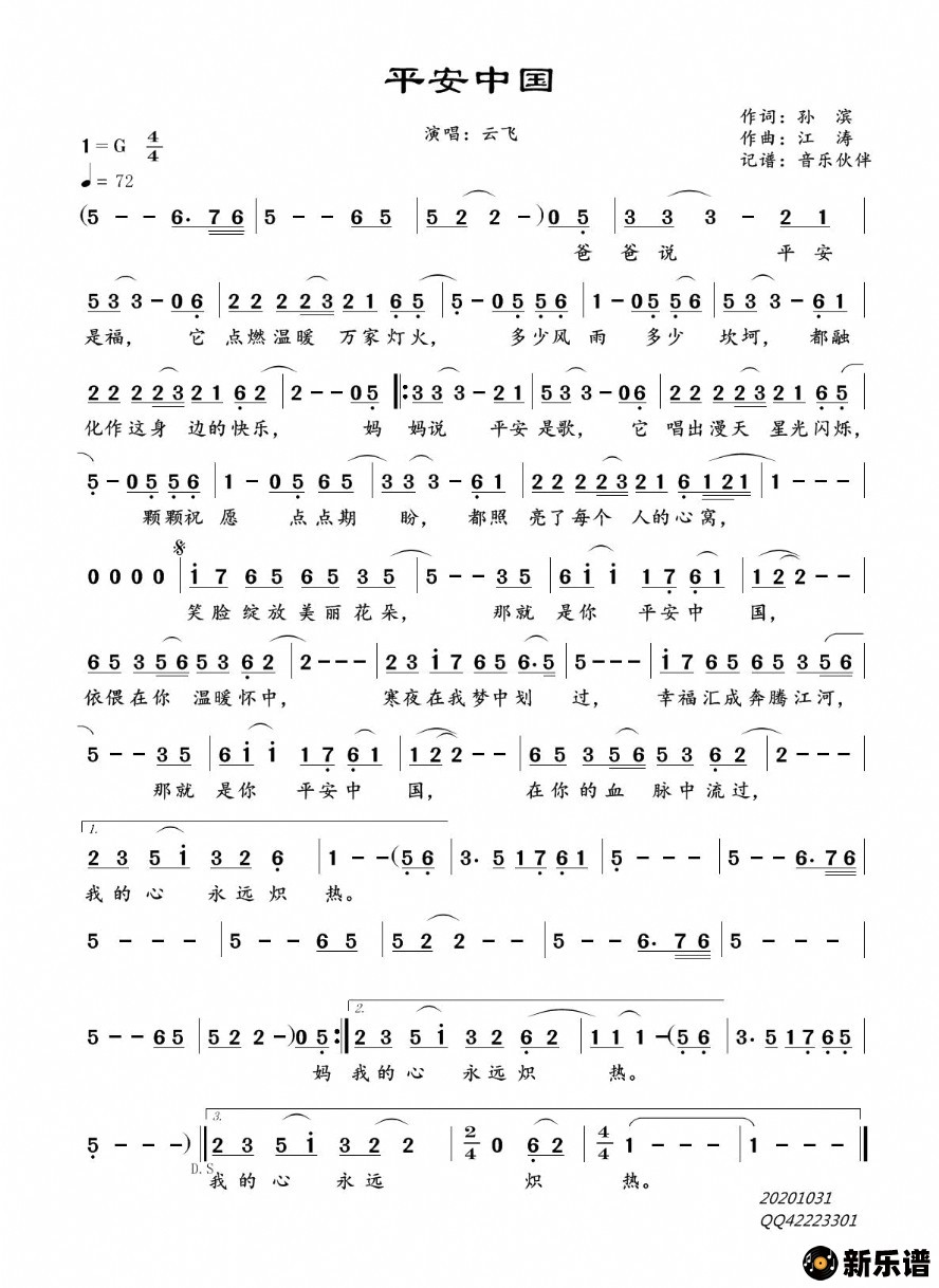 《平安中国》简谱 云飞-音乐伙伴制谱
