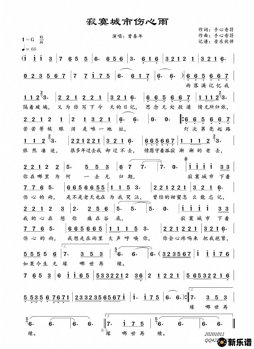 《寂寞城市伤心雨》简谱 曾春年-音乐伙伴制谱