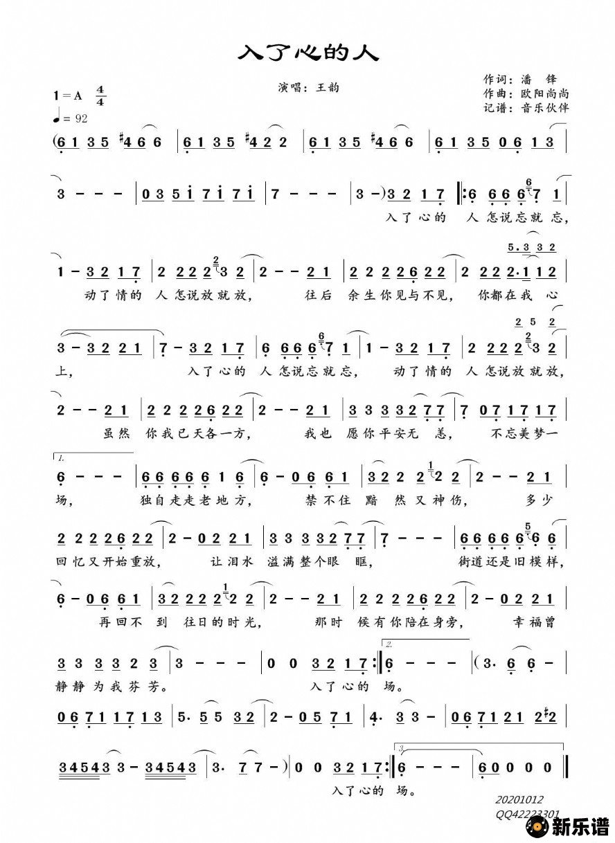 王韵演唱的入了心的人歌词,入了心的人简谱.
